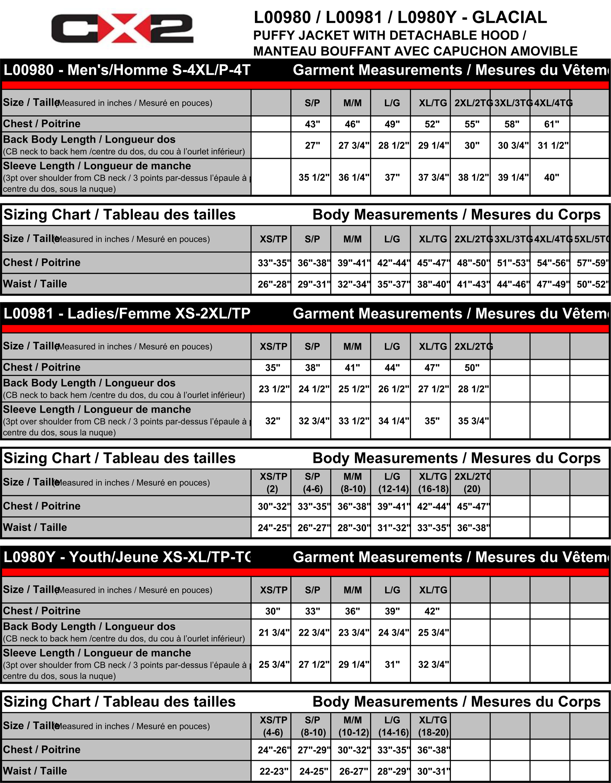 65 gsm – 1.9 oz./yd2 – 3.5 oz./lin. yd 100% polyester taffeta, wind and water resistant finish. Insulation: 180 gsm 100% polyester. Detachable hood with zipper. Adjustable drawcord in hood (not available on youth). Zippered pockets, elastic binding on sleeve and body hem. YKK zippers.